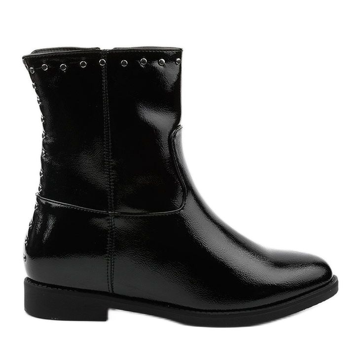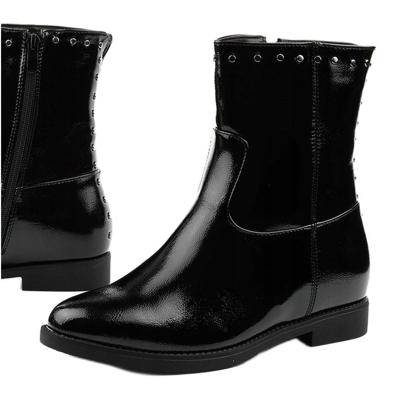 A kiváló minőségű ökológiai bőrből készült csizmát lakkbőr felsőrész jellemzi, amely modern karaktert ad. A litoszcsík és strassz formájú díszítés szemet gyönyörködtetővé és tökéletes választássá teszi ezeket a cipőket a divatos dizájnt értékelő nők számára.