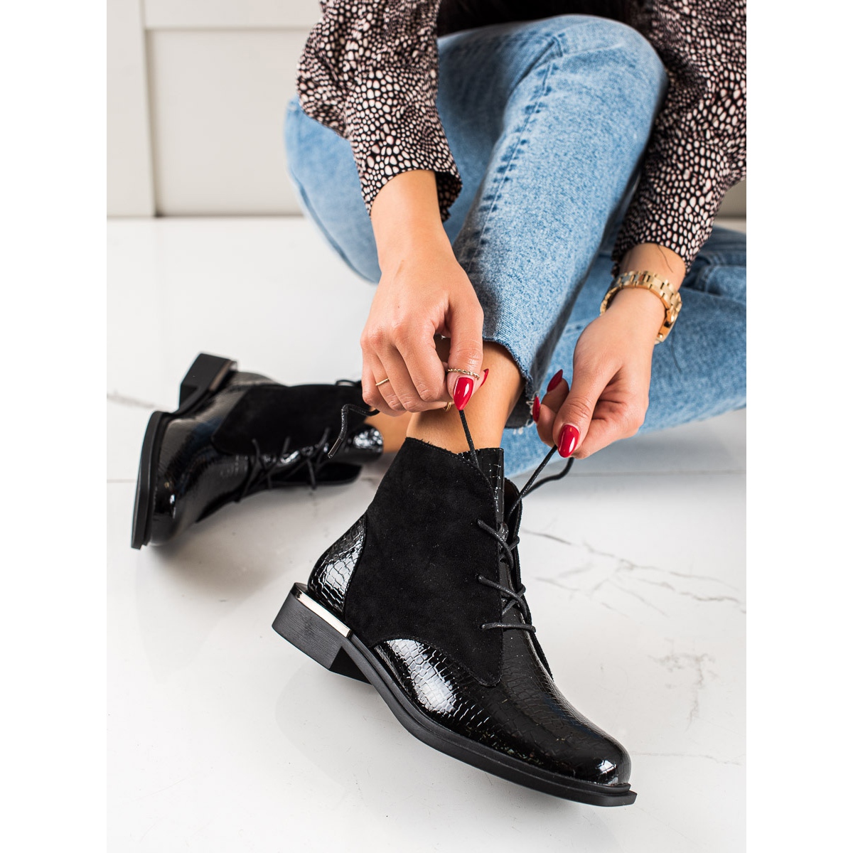 A kiváló minőségű anyagokból készült csizmák felsőrésze ökológiai bőrből készült, velúrutánzat hozzáadásával, amely egyedi karaktert kölcsönöz neki. Az eredeti állatminta vonzza a figyelmet, a fekete szín pedig rendkívül univerzálissá teszi őket.