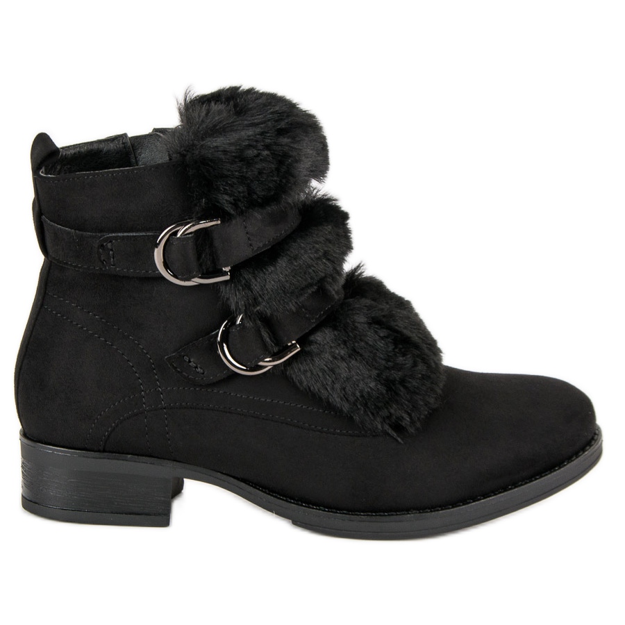 A fekete bundás csizmák kerek orrúak és cipzárral vannak rögzítve, ami megkönnyíti a fel- és levételüket. Ezüst csatokkal díszített pántok külön hangsúlyozzák egyedi stílusukat. A könnyű 3,5 cm-es sarok kényelmes viseletet tesz lehetővé egész nap, alkalomtól függetlenül.