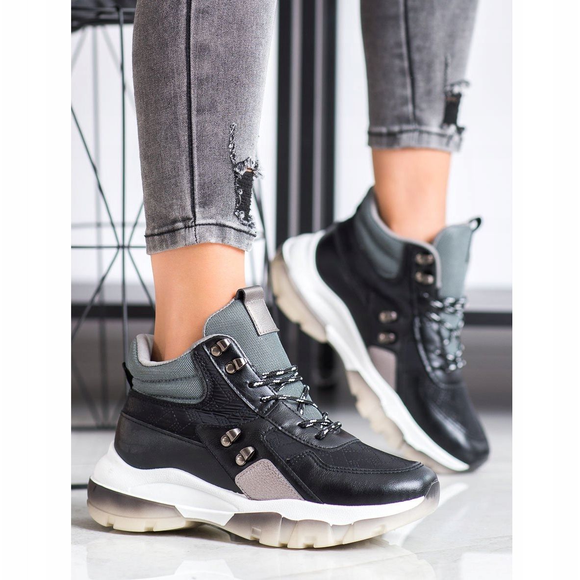 A fekete SHELOVET tornacipők sokszínű díszítéssel olyan nők számára készültek, akik szeretnének kitűnni a tömegből. Ne habozzon, és legyen tulajdonosa ennek az egyedülálló modellnek, amely minden bizonnyal sok mindennapi stílus alapja lesz. Amikor megvásárolja ezeket a cipőket, nem csak a divatot, hanem a kényelmet is választja!