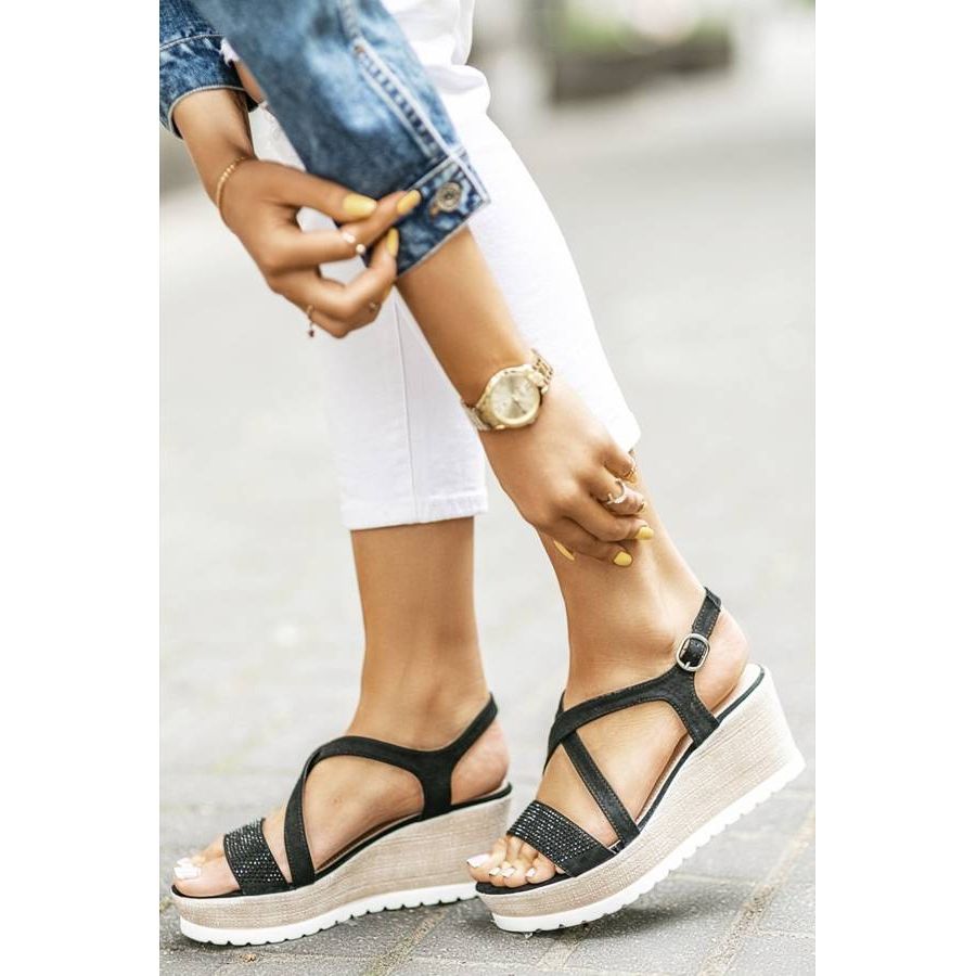 A Sadie fekete ékszandálja tökéletes választás azoknak a nőknek, akik értékelik a stílust és a kényelmet egyaránt. Ezeket az elegáns platformszandálokat a fekete flitterekkel borított elülső pánt jellemzi, amely egyedi varázst ad nekik, és tökéletes kiegészítője lehet bármilyen nyári stílusnak.