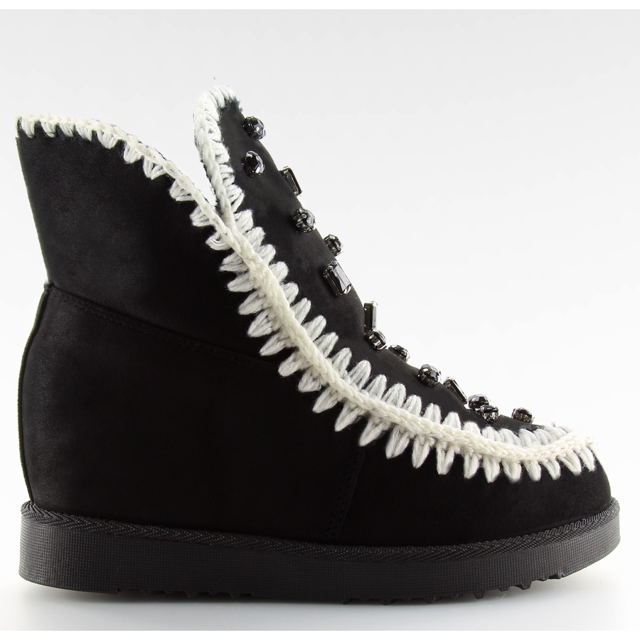 Lenyűgöző fekete női bokacsizma 5,5 cm magas ékkel, amely a divatos megjelenést a mindennapi kényelemmel ötvözi. Eleje elegáns strasszokkal díszített, a dekoratív gyapjúöltés pedig karaktert és egyedi megjelenést kölcsönöz. Magas talpa szigetel a hideg ellen, a szőrmével bélelt belső pedig kellemes meleget garantál a hidegebb napokon.