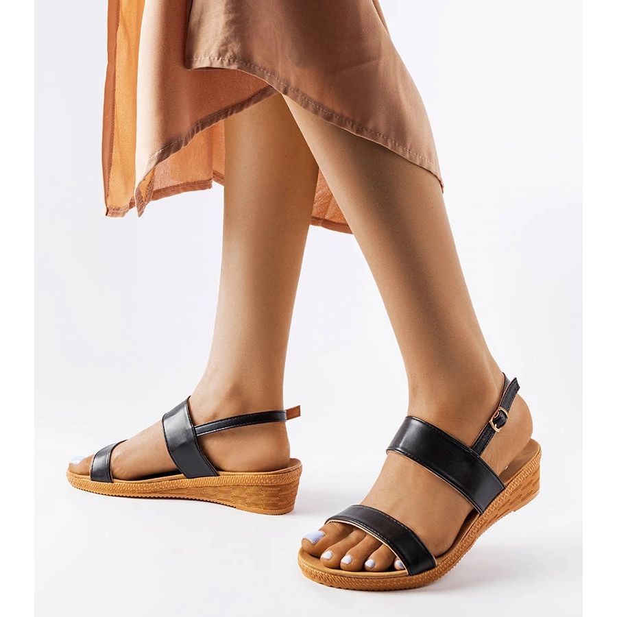 Klasszikus, kényelmes ék szandál, tökéletes a nyári napokra. A sima, elegáns, univerzális fekete színű forma jól illeszkedik mind a mindennapi, mind az elegánsabb stílushoz. A 4 cm -es magas ék biztosítja a stabilitást és óvatosan emelést anélkül, hogy feladja a kényelmet.