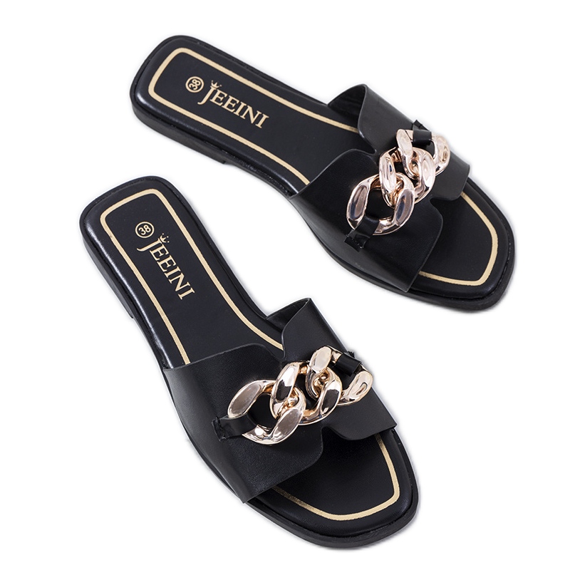 A fekete elegáns Mary láncos papucsok elengedhetetlenek ezen a nyáron, mivel luxust és stílust kölcsönöznek ruhatárának. Kiváló minőségű ökobőrből készült, klasszikus fekete színben, ezek a papucsok tökéletesek a nyári napokra, egyszerre nyújtanak kényelmet és eleganciát.