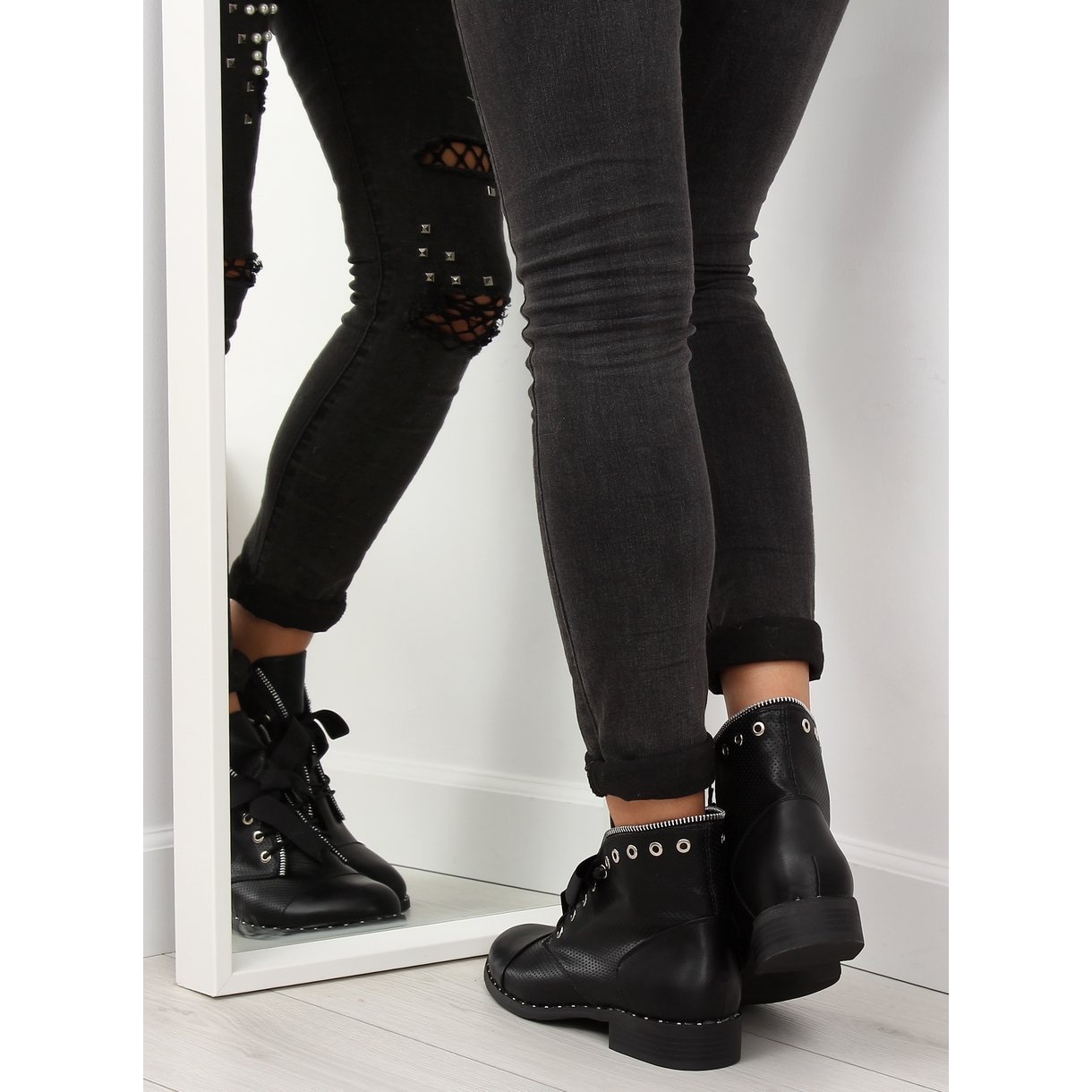 Fedezze fel az eredeti 17018-9 fekete női bokacsizmát, amely tökéletesen ötvözi a rock stílust a romantikus részletekkel. Ezek a fűzős cipők finom masnival és dekoratív szegecsekkel tűnnek ki, amelyek felkeltik a figyelmet, és karaktert kölcsönöznek bármilyen stílusnak. Az áttört felület nemcsak divatossá, hanem kivételesen lenyűgözővé is teszi a csizmát.