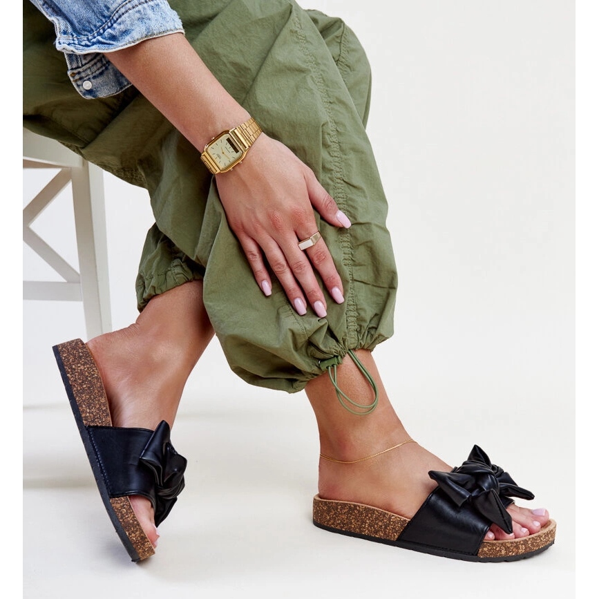 Fekete flip -flopok egy parafa talpon, egy petressa íjval, nagyszerű választás minden nő számára, aki a stílust és a kényelmet szeretné kombinálni. Ezek a kerek orrú, stílusos papucsok a legújabb tendenciák részét képezik, és abszolút kötelezővé válnak a nyári napokra. Kiváló minőségű gumiból készült, és nemcsak kényelmet, hanem tartósságot is kínálnak.
