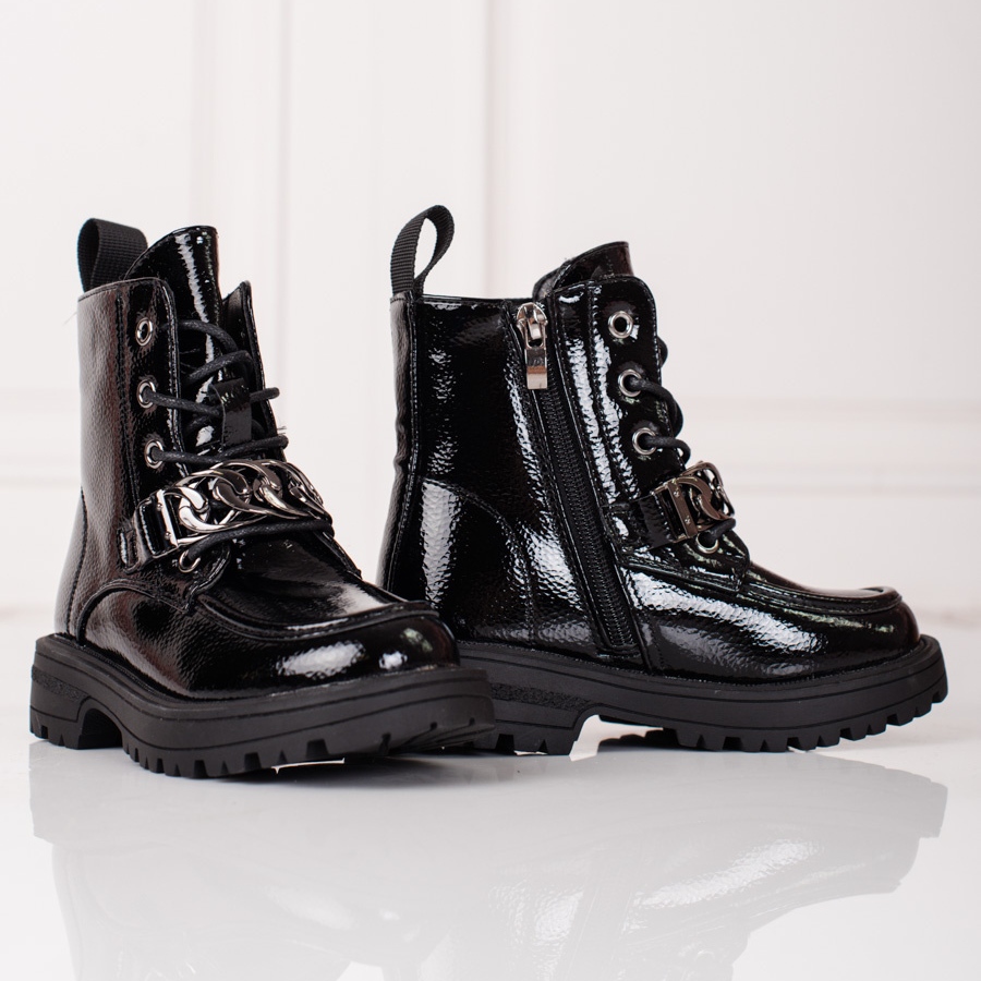 Klasszikus, kényelmes és meleg - Ezek a fekete csizmák egyetemes választás egy lány számára hidegebb napokra. Ökológiai bőrből készült, lágy, beépített sarokú sarokokkal és kellemes melegítéssel lábbeli takaró formájában, egyesítsen egy alkalmi és elegáns stílust, ideális mind az iskola, mind a családi kirándulásokhoz.