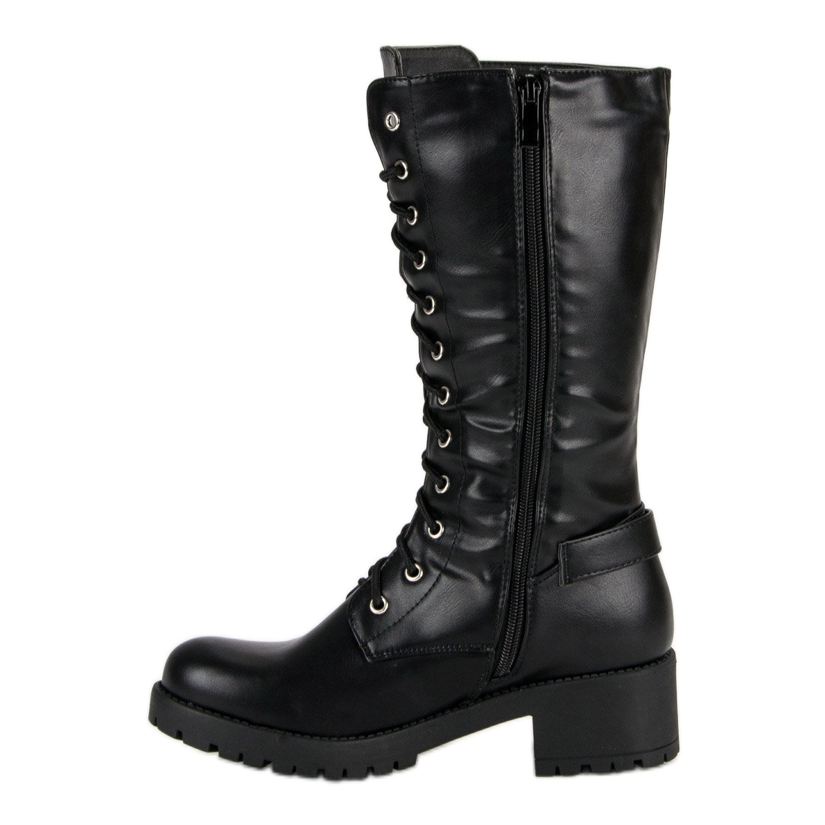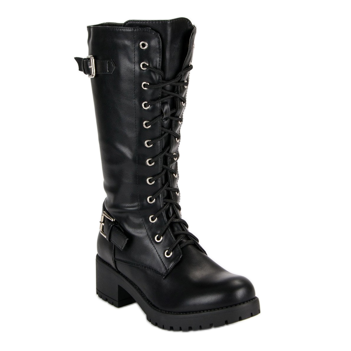 A fekete csizmák praktikus cipzárral és fűzős zárással rendelkeznek, amely tökéletes illeszkedést tesz lehetővé bármely vádlihoz. Az ezüst csatokkal ellátott további dekoratív pántok jellegzetes, merész megjelenést kölcsönöznek nekik, tökéletesek azoknak a nőknek, akik szeretnének némi érzéket adni stílusukhoz.