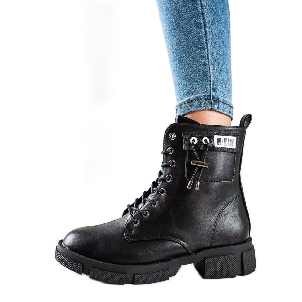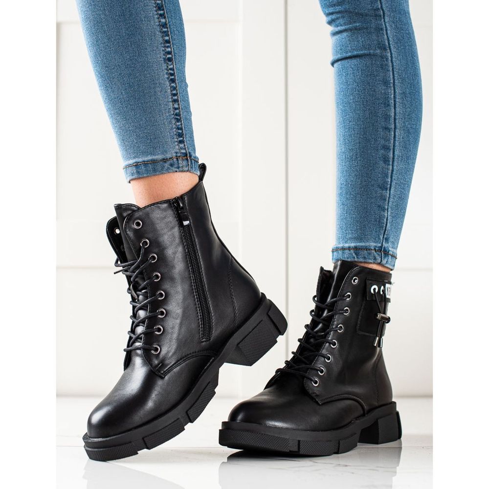 A fekete munkáscsizmát egy dekoratív csík különbözteti meg, amely eredetivé teszi, és kiemelkedik a tömegből. A kerek orr és a 4 cm-es lapos sarok biztosítja a kényelmet a hosszú séták során, a cipzár és a fűzés pedig megkönnyíti a felhelyezést és a lábhoz való igazodást.