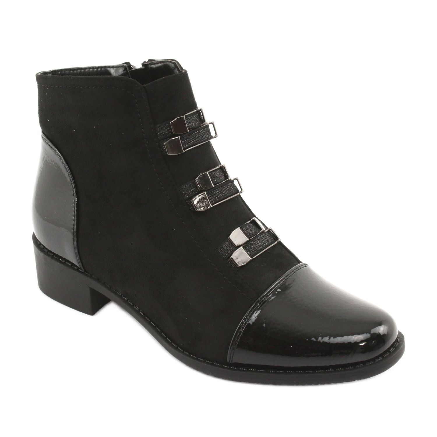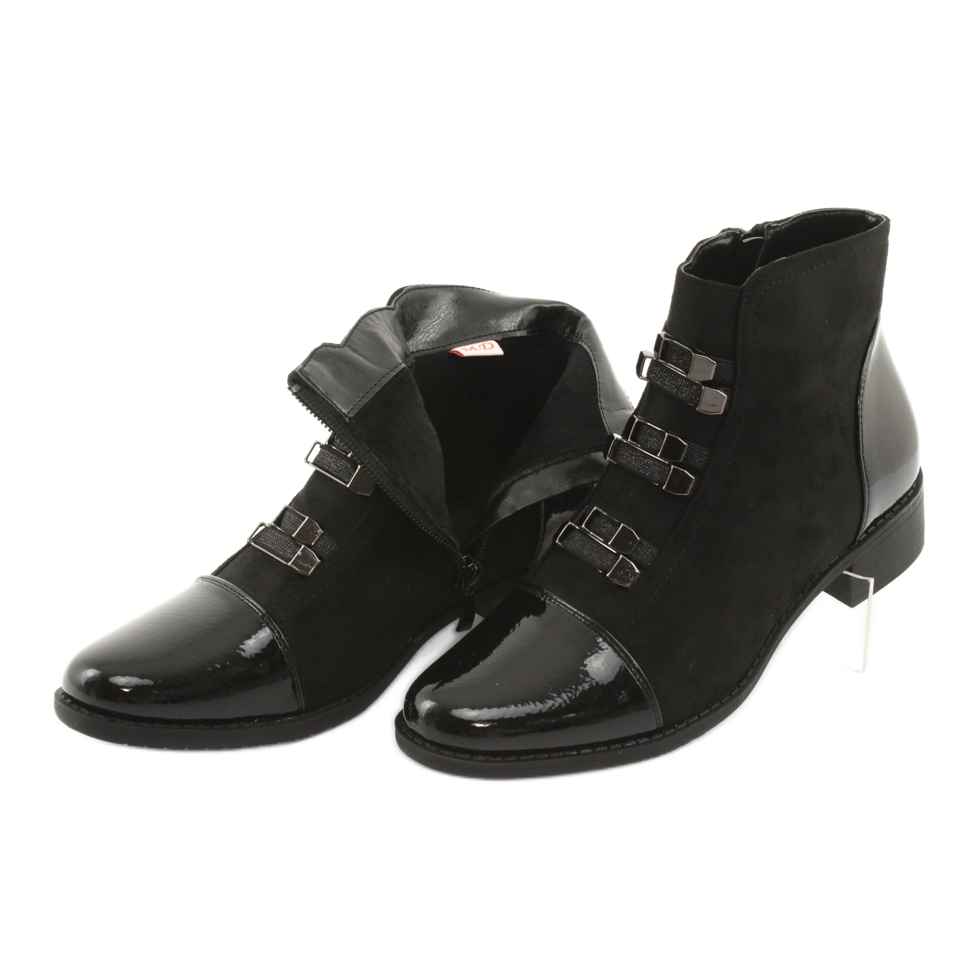A csizmát lapos sarok és eredeti díszítés jellemzi, finom csatok formájában az elején, amely modern karaktert ad. A modell puha fekete szőrmével van bélelve, így a hidegebb napokon is kényelmet és meleget biztosít. Alkalomtól függetlenül remek választás minden évszakra.