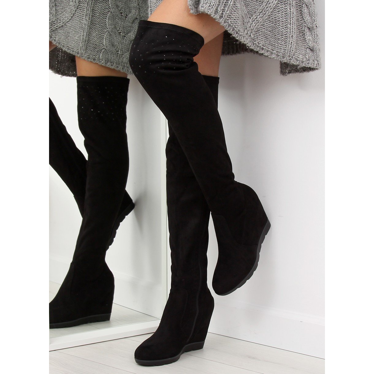 Fedezze fel az egyedi stílust és eleganciát a klasszikus fekete színű K-59 ékmuskétásszal. Ezek a lenyűgöző női cipők, amelyeket a modern nők szem előtt tartásával terveztek, tökéletesen ötvözik a divatot a kényelemmel. A térd felett érő, finom kövekkel díszített felsőrész nem csak karcsúsítja az alakot, hanem elegánsabbá is teszi bármely stílust.