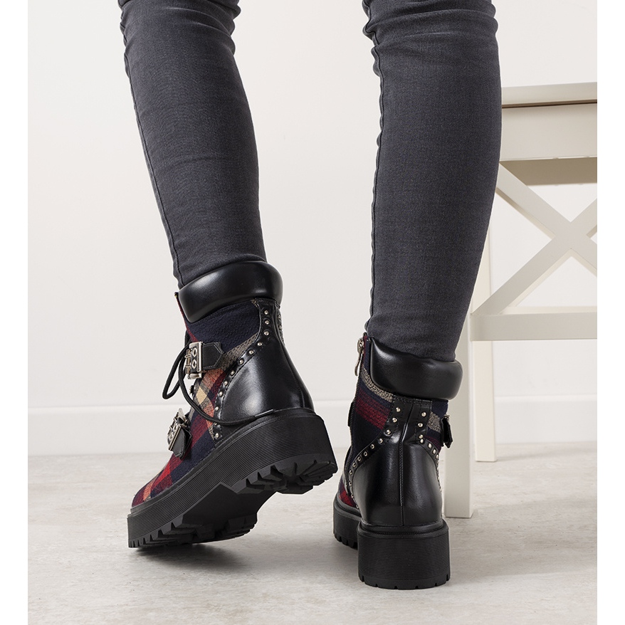 A csizmák felsőrészét egy bájos kockás minta díszíti a piros, sötétkék és bézs harmonikus árnyalataiban, amely eredeti karaktert ad. Az állítható fűzésnek és dekoratív pántoknak köszönhetően az Ön igényeihez igazíthatja illeszkedésüket, a cipzár pedig megkönnyíti a fel- és levételüket.