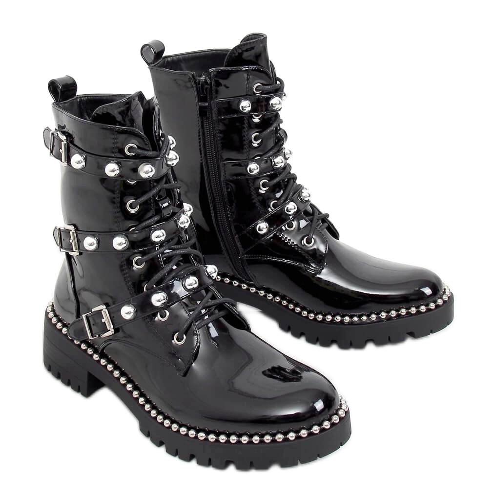 A lakkozott felülettel és a szemet gyönyörködtető ezüst golyókkal rendelkező bokacsizmák felkeltik a figyelmet, és egyedi karaktert adnak minden stílusnak. A fűzős felsőrésznek és a praktikus oldalsó cipzárnak köszönhetően a cipő felvétele gyors és kényelmes.