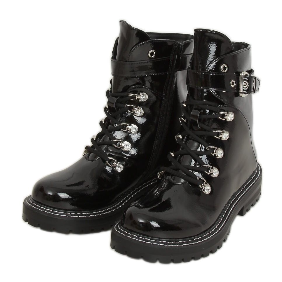 Ismerje meg a 8120-PA Black női fekete lakkcsizmát - ideális ajánlat azoknak a divat szerelmeseinek, akik szeretnének kitűnni a tömegből! Ez a fűzős bokacsizma az elegancia és az extravagáns kombinációja, a hurkokon lévő fényes köveik pedig egyedi karaktert kölcsönöznek. A lakkozott felület nemcsak vonzóvá, hanem praktikussá is teszi őket, tökéletesek a mindennapi kirándulásokhoz.