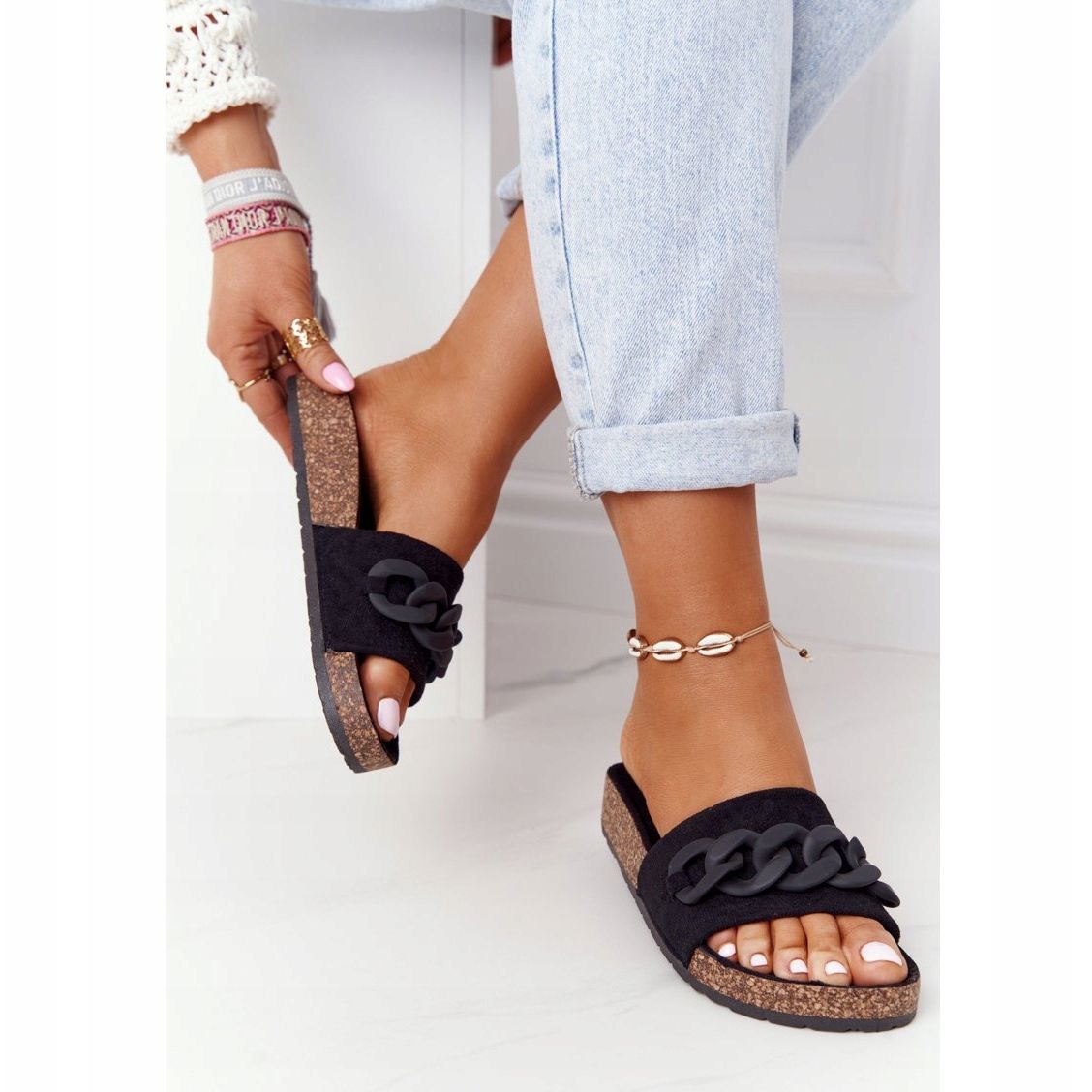 Ezeket a papucsokat egy finom díszítőlánc jellemzi, amely elegáns akcentust ad hozzájuk, így tökéletesen illeszkedik a különböző stílusokhoz. A csúszós rögzítésnek köszönhetően fel- és levételük gyors és kényelmes. A 3 cm magas szintetikus talp biztosítja a stabilitást és a párnázást, ami minden, a papucsban eltöltött pillanatot tiszta élvezetté tesz.