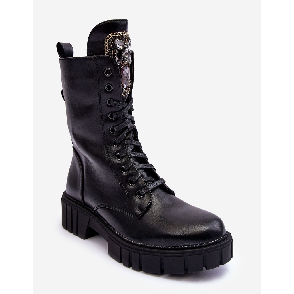 A csizmák boka felsőrésszel rendelkeznek, amely egy funkcionális és stílusos elemet tartalmaz ékszer díszítés formájában a nyelven. Elegáns karaktert kölcsönöz a lábbelinek, így kiemelkedik a klasszikus modellek közül. Sőt, a kényelmes használat érdekében elöl praktikus fűzővel és egy további cipzárral vannak felszerelve a könnyű felhelyezés érdekében.