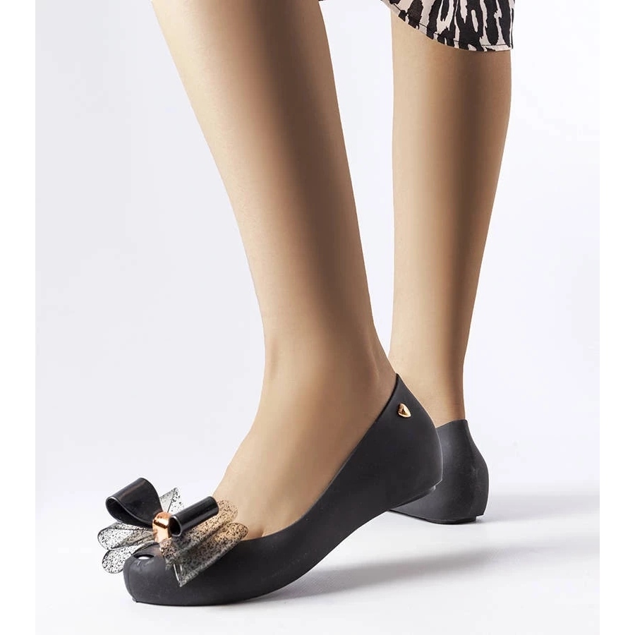 A felső, a boka finom szálával díszítve, egyedi karaktert ad nekik. A kerek orrán van egy látványos íj, amely vonzza a megjelenéseket, és romantikus varázst ad hozzá. Kiváló minőségű gumiból készült ballerinák nemcsak stílusosak, hanem praktikusak és könnyen ápolhatók is.