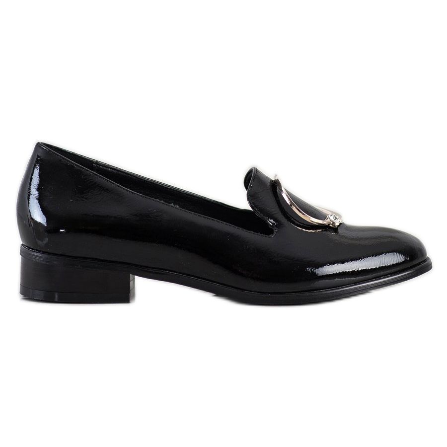 Rendkívüli fekete mokaszinokat mutatunk be Vinceza díszítéssel, amelyek a kényelmet elegáns stílussal ötvözik. Ez a lakkbőrből készült, felbújós cipő tökéletes választás azoknak a nőknek, akik értékelik a kényelmet és a divatos megjelenést egyaránt. Mélyfekete színük tökéletesen elüt az orrrészen található ízléses ezüst díszítéssel, amely karaktert és eleganciát kölcsönöz nekik.