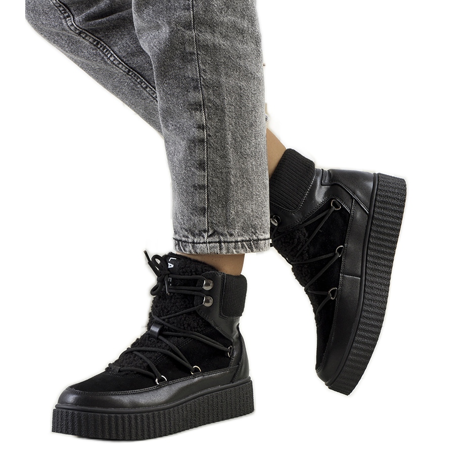 A cipő belseje meleg szőrmével van bevonva, amely hatékonyan véd a hideg ellen, és egyben hangulatos karaktert ad. A fűzős rögzítés tökéletes illeszkedést tesz lehetővé a lábfejhez, ami minden lépésnél kényelmet garantál. A kerek orr és a 3,5 cm magas platform stabilitást és kényelmet biztosít, valamint optikailag meghosszabbítja a lábakat.