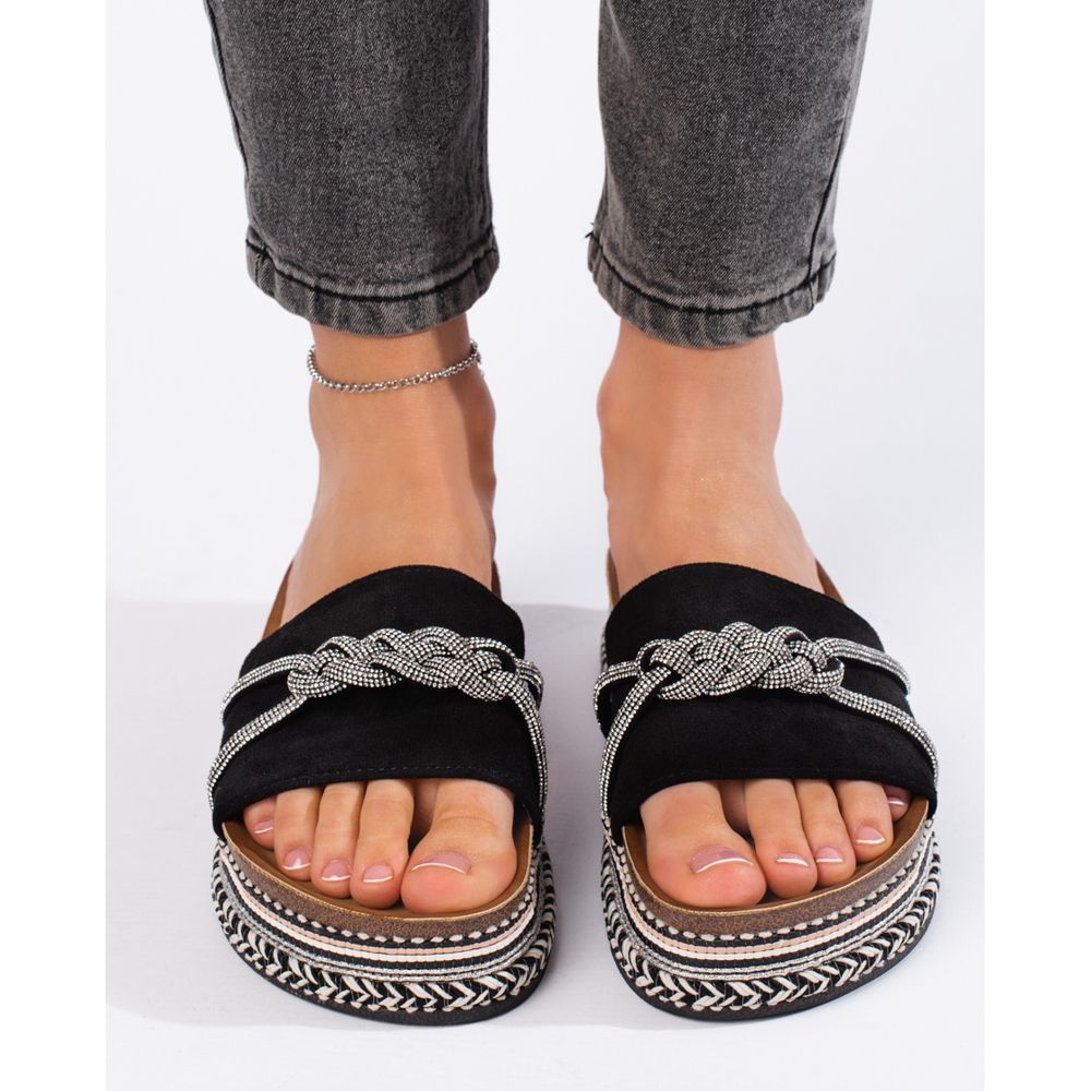 Fedezze fel az eleganciát és a kényelmet az Inna márka fekete, díszítéssel ellátott női papucsaival! Ezek a stílusos papucsok tökéletes választás a mindennapokra, ötvözik a klasszikus dizájnt a hétköznapi stílussal. Kiváló minőségű ökológiai velúrbőrből készültek, így a tartósság és az esztétika tökéletes kombinációja.