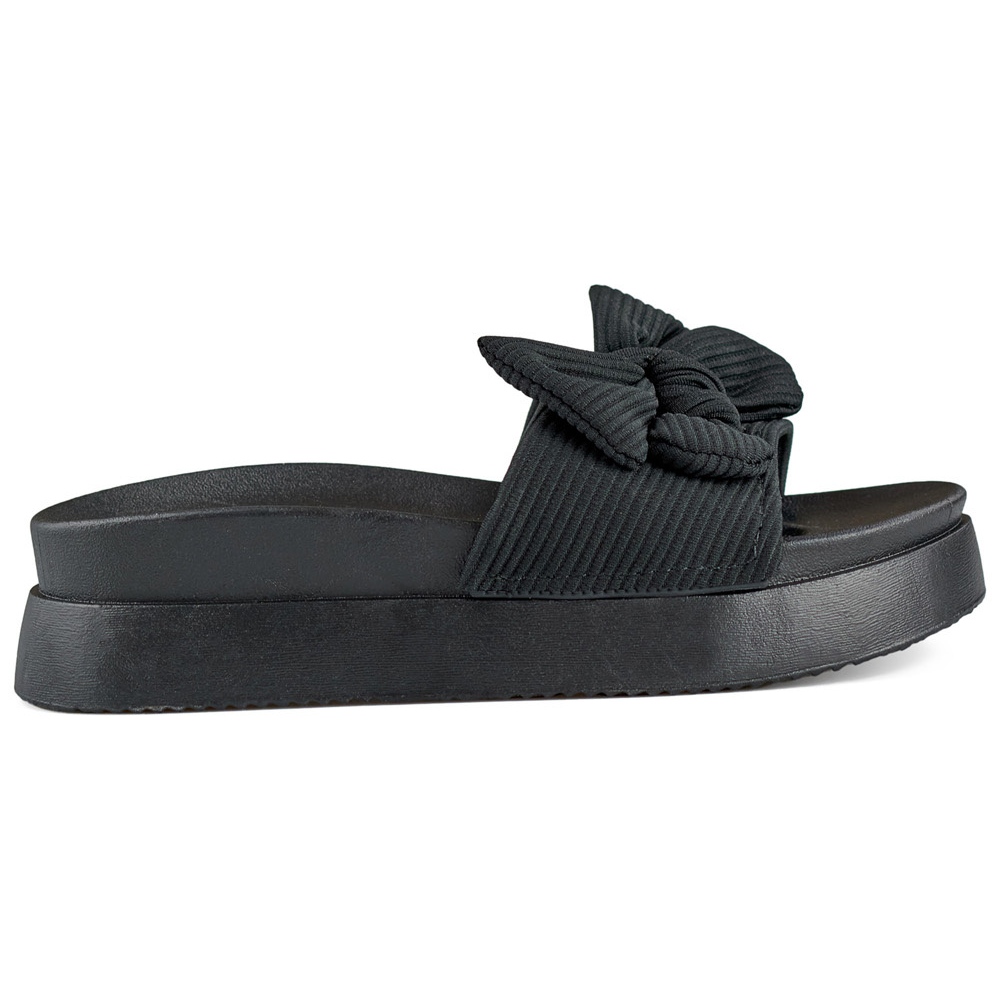 Női papucsok vastag talpon masnival, tökéletesek a mindennapi kirándulásokhoz és a meleg napok pihentető pillanataihoz. Kiváló minőségű textil anyagokból készültek, biztosítják a kényelmet és a könnyű használatot. Az elegáns fekete felület sok stílushoz illik, a masni formájú kiegészítő akcentus pedig varázst ad.