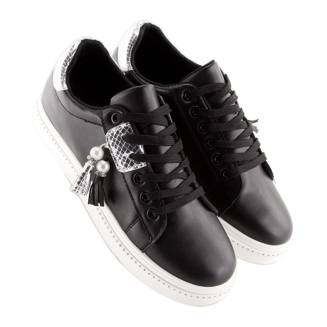 Fedezz fel egyedi stílust a 88038 BLACK/WHITE női fekete tornacipővel, amely minden bizonnyal ruhatárad elválaszthatatlan elemévé válik. Klasszikus szabásuk divatos, gyöngyökkel díszített rojtokkal kombinálva egy csipetnyi eleganciát ad minden stílushoz. A talp körüli strasszokkal díszített finom díszítés egy csillogást ad, így tökéletesek hétköznapi és elegánsabb ruhákhoz is.