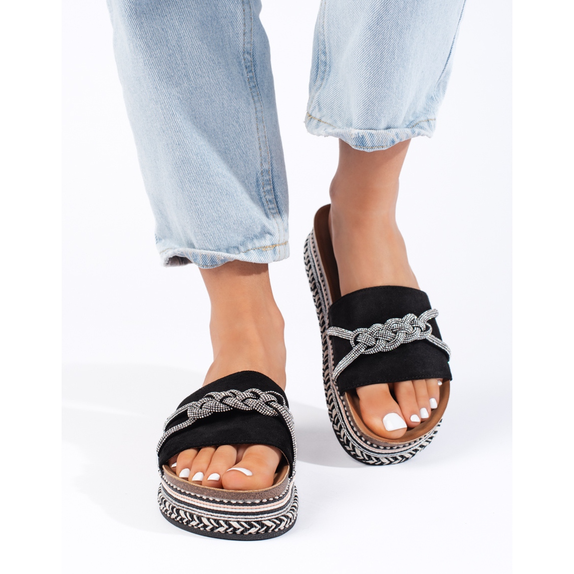Ezenkívül a velúrutánzatból készült belső talpbetét kényelmes érzést ad a lábnak, a strassz pedig egyedi fényt ad a papucsoknak. A klasszikus fekete színnek köszönhetően számos stílushoz passzolnak – a hétköznapoktól az elegánsabbakig.