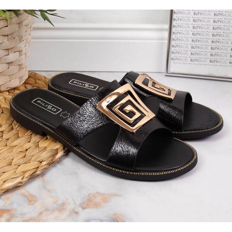 Az elegáns, könnyű és kényelmes Filippo papucs finom dekorációval a tökéletes javaslat a nyárra - mind a város körüli séta, mind az ünnepi kiránduláshoz. A klasszikus fekete szín és a minimalista megjelenés sokféle stílushoz kapcsolja őket.