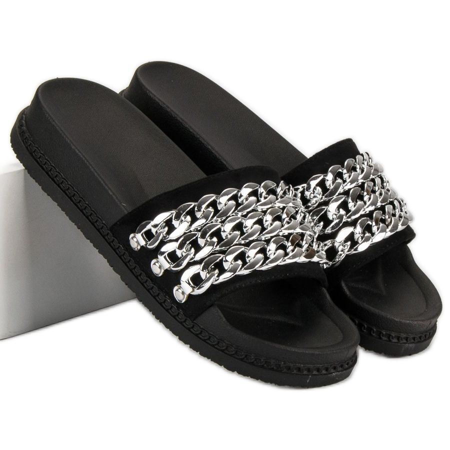 A papucsok fekete színének köszönhetően bármilyen ruhához passzolnak – az alkalmi tréningruháktól a nyári ruhákig. A lábujj hiánya lehetővé teszi a lábak szabad szellőzését, a 3 cm-es sarokmagasság pedig finom kényelmet biztosít. A papucsokon nincsenek minták, így könnyen kombinálhatók más ruhadarabokkal.