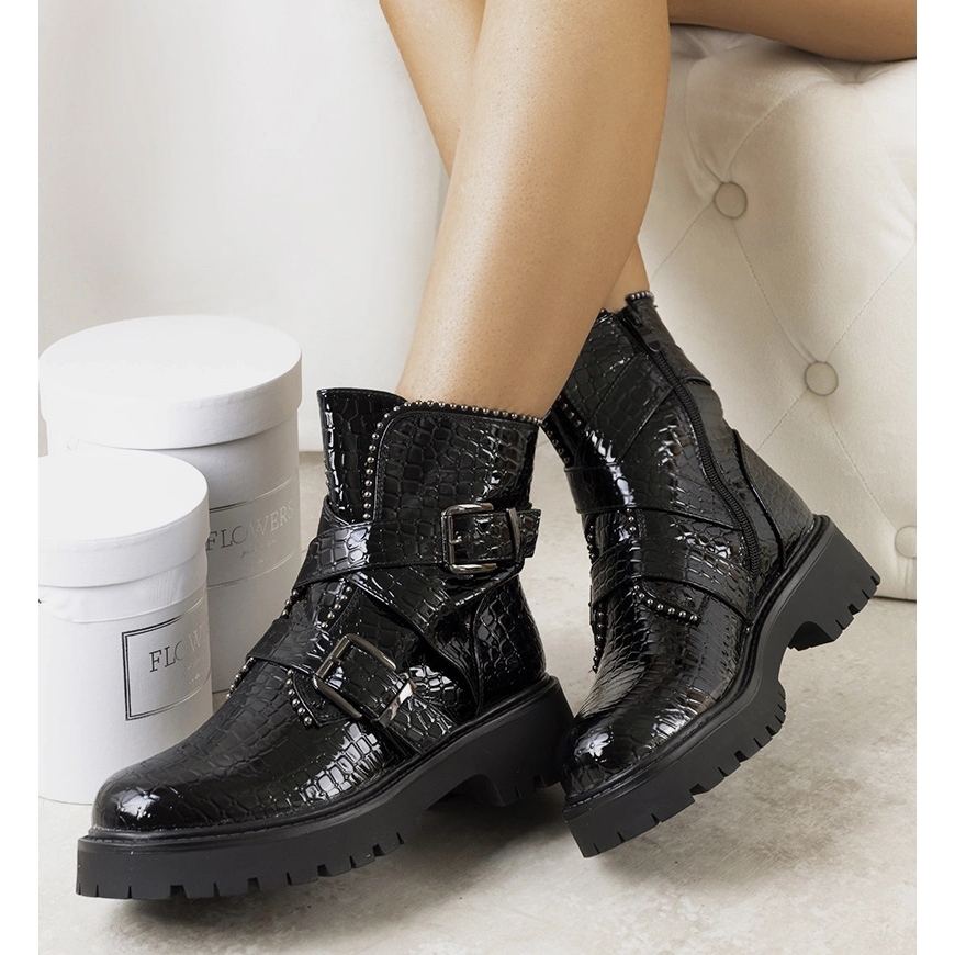 Az elegáns helia csizma javaslatot jelent azoknak a nőknek, akik szeretik a klasszikusokat kifejező részletekkel kombinálni. A felső rész lakkozott ökológiai bőrből készül, amely egy utánzó krokodilt és fényes kiegészítéseket - gyöngyöket, strasszokat és fúvókákat - nyomja meg, és a cipőnek egyedi karaktert ad a cipőnek. A belső teret meleg anyaggal készítik, amely utánozza a szőrmeket, köszönhetően a modell hűvösebb napokon.