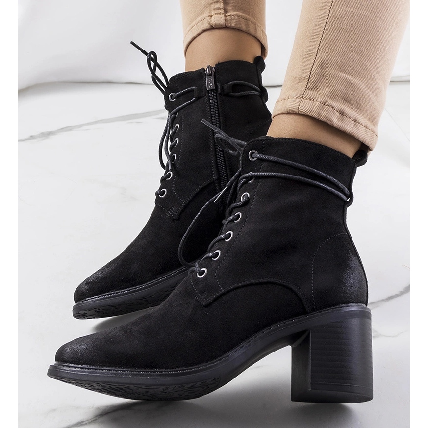Stílusos, alkalmi Sanlow -csizmák, fekete színű, velúr öko -léből. Modell egy stabil oszlopon (6,5 cm), teljes magasságú, 19,5 cm (boka), négyzet alakú orr, oldalsó kastély és dekoratív kötés a boka mellett. Kissé szigetelve egy "lábbeli takaróval" - tökéletes az őszi/téli szezonra.