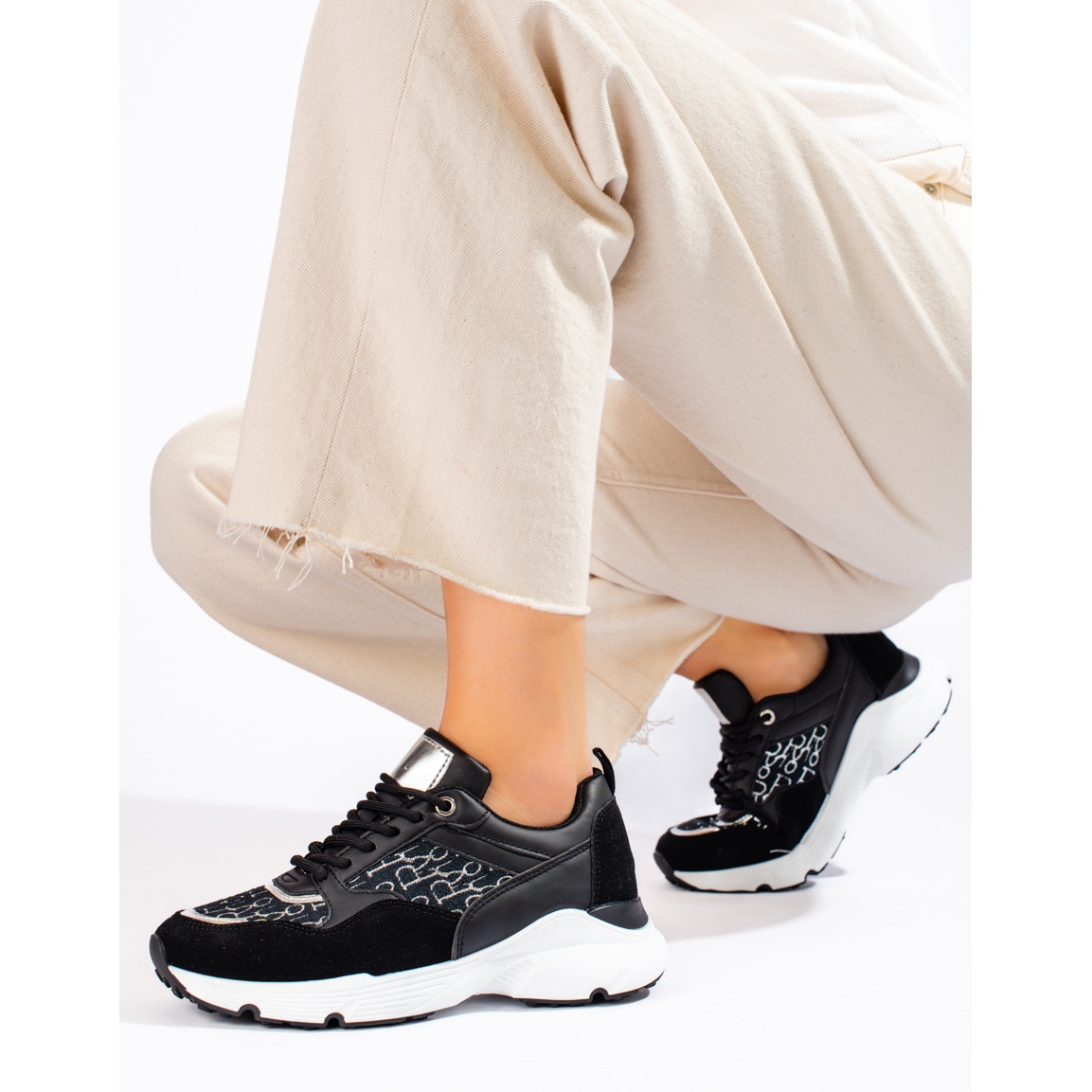 A vastag talpú fekete Shelovet női tornacipő a kényelem és a kifinomult stílus tökéletes kombinációja azoknak a nőknek, akik értékelik a divatos megjelenést és a mindennapi kényelmet. A textilanyag és a kiváló minőségű műbőr kombinációja strapabíró és vonzó cipőtextúrát hoz létre.
