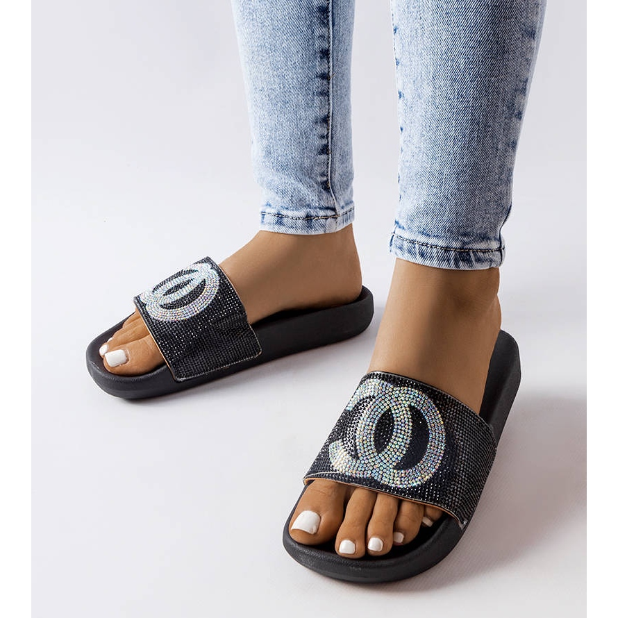 A fekete strasszokkal díszített Glendale csúszdák kötelező darabjai a nyári napoknak, ötvözik a stílust és a kényelmet. A kiváló minőségű eco-bőrből készült csúszdák elegáns dizájnjukkal és tetszetős részletekkel tűnnek ki, amelyek fényes cirkóniák formájában minden stílushoz csillogást kölcsönöznek.