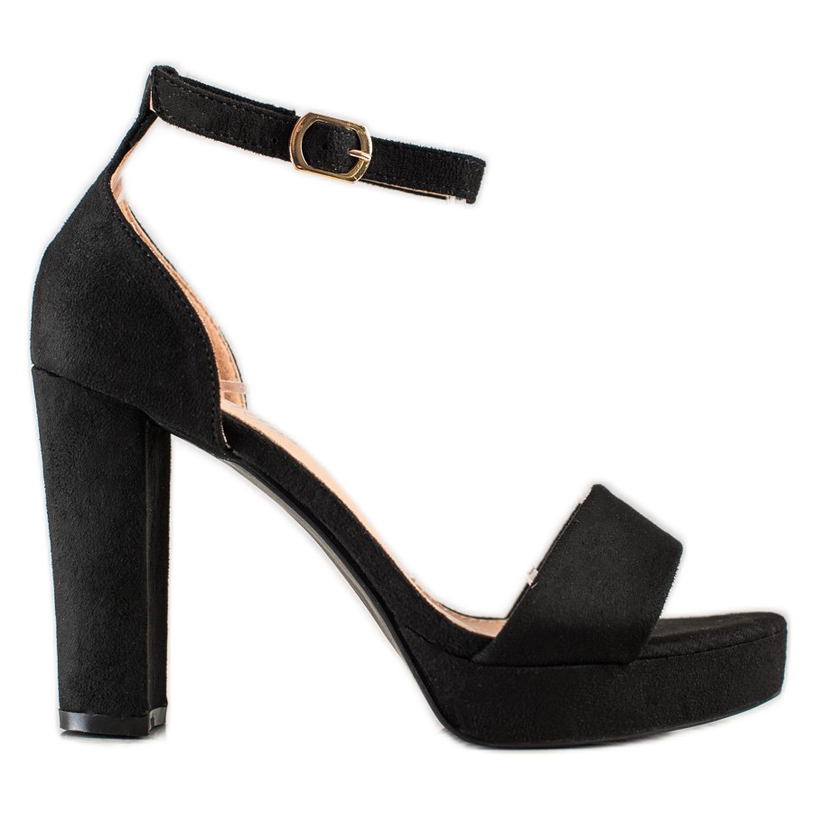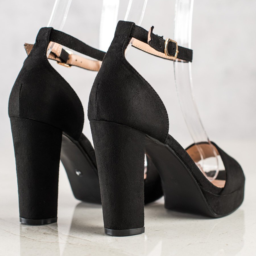 A szandálokat klasszikus dizájn jellemzi, nyitott sarokkal, amely varázst ad hozzájuk. A széles, 10 cm magas oszlop biztosítja a stabilitást és a viselési kényelmet, lehetővé téve, hogy élvezze minden pillanatát anélkül, hogy aggódnia kell a lábfájás miatt. A velúrutánzatból készült szandál rendkívül stílusosnak tűnik, az ökobőrből készült belső anyag pedig a kényelemről gondoskodik.