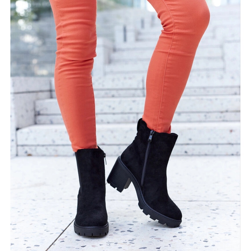 A klasszikus, minimalista vágás fekete ökológiai velúrban teszi ezeket a csizmákat a ruházat univerzális elemévé. Elérik a bokát (21 cm magasság), és mandula orruk van, amely szépen meghosszabbítja az ábrát, és egy 8 cm magasságú blokk stabil sarkát növeli a nőiesség és a bizalom, anélkül, hogy feladta a kényelmet. A szigetelt talpbetét kellemes meleget biztosít alacsonyabb hőmérsékleten, annak köszönhetően, hogy a cipő ősszel nagyszerű -e -Wyosna évszakok.