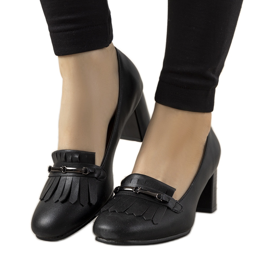 A fekete Alicea magassarkú pumpák a tökéletes választás azoknak a nőknek, akik értékelik az eleganciát és a kényelmet. Ezek a stílusos mokaszin stílusú cipők kiváló minőségű ökológiai bőrből készültek, ami nem csak esztétikussá, hanem környezetbaráttá is teszi. A közepes méretű sarok tökéletesen kiemeli a lábakat, a finoman lekerekített orr pedig optikailag karcsúsítja a lábfejet, így karcsúbb lesz.
