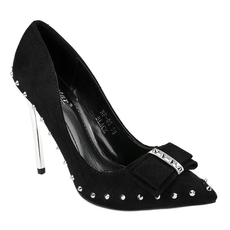 Az NF-05 fekete magassarkú pumpák tökéletes választás az eleganciát és a stílust értékelő nők számára. Minimalista dizájnjukat szemet gyönyörködtető fémes szegecsekkel és elöl masnival gazdagítják, ami egyedi karaktert kölcsönöz nekik. Ezek a cipők nemcsak az eredeti részleteknek, hanem a magas, 11 centiméteres tűsarkának köszönhetően is felkeltik a figyelmet, amely optikailag meghosszabbítja a lábakat és önbizalmat ad.
