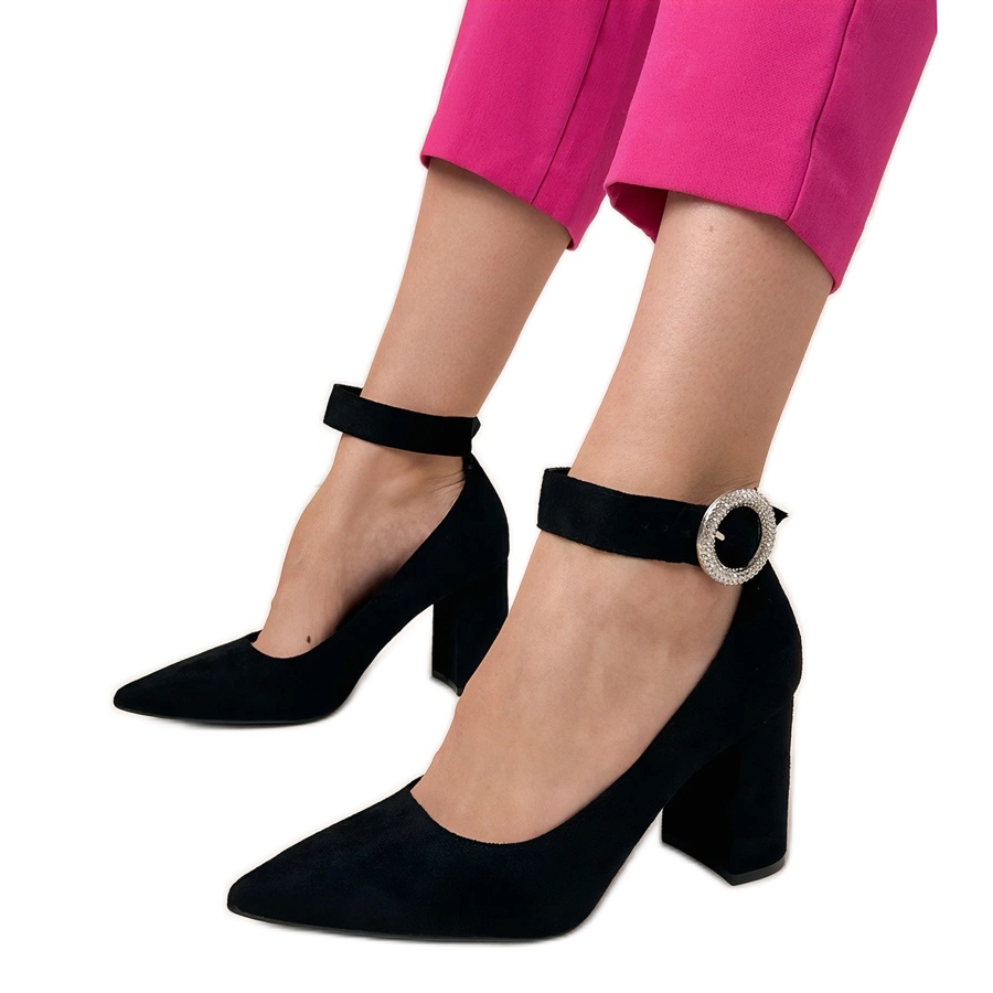Itt vannak a fekete szivattyúk az oszlopban, csatával és cirkonokkal - egy igazi gyöngy a ruhásszekrényben! Ezek az elegáns cipő, amely kiváló minőségű ökológiai velúr bőrből készül, a modern stílust kombinálja a klasszikus elemekkel, ami sok alkalommal ideális választássá teszi őket, a hivatalos találkozóktól a romantikus estékig.