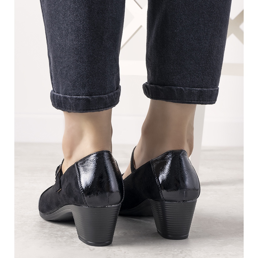 Ezeknek a cipőknek a klasszikus fekete színe tökéletesen passzol a különböző stílusokhoz, mind mindennapi használatra, mind hivatalosabb alkalmakra. A kerek orr és a minták hiánya a pumpákat időtlenné és mindig a tetején teszi. Ezenkívül a csat biztosítja a biztonságos illeszkedést.