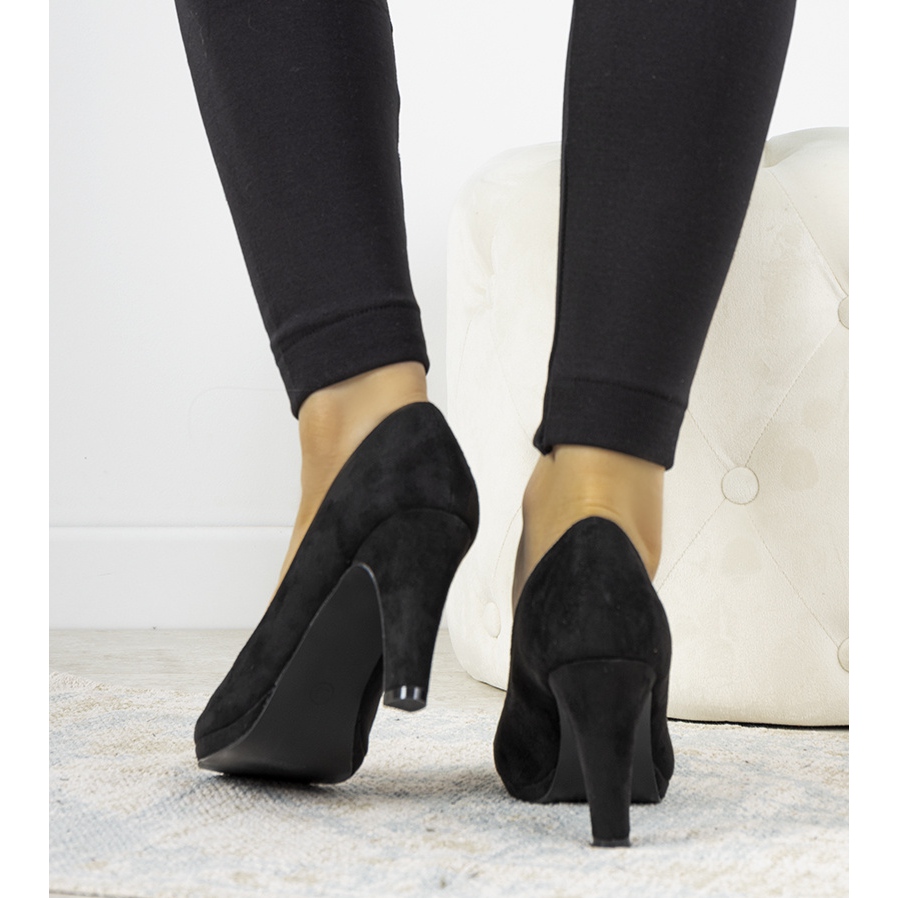 A Sara ökobőrből készült fekete magassarkú pumpák tökéletes választás az eleganciát és a kényelmet értékelő nők számára. Kiváló minőségű velúr ökológiai bőrből készültek, nem csak stílusos megjelenést, hanem viselési kényelmet is biztosítanak. A klasszikus szabás finoman lekerekített orrral optikailag karcsúsítja a lábat, a közepes méretű sarok pedig tökéletesen kiemeli a lábakat, eleganciát adva hozzá.