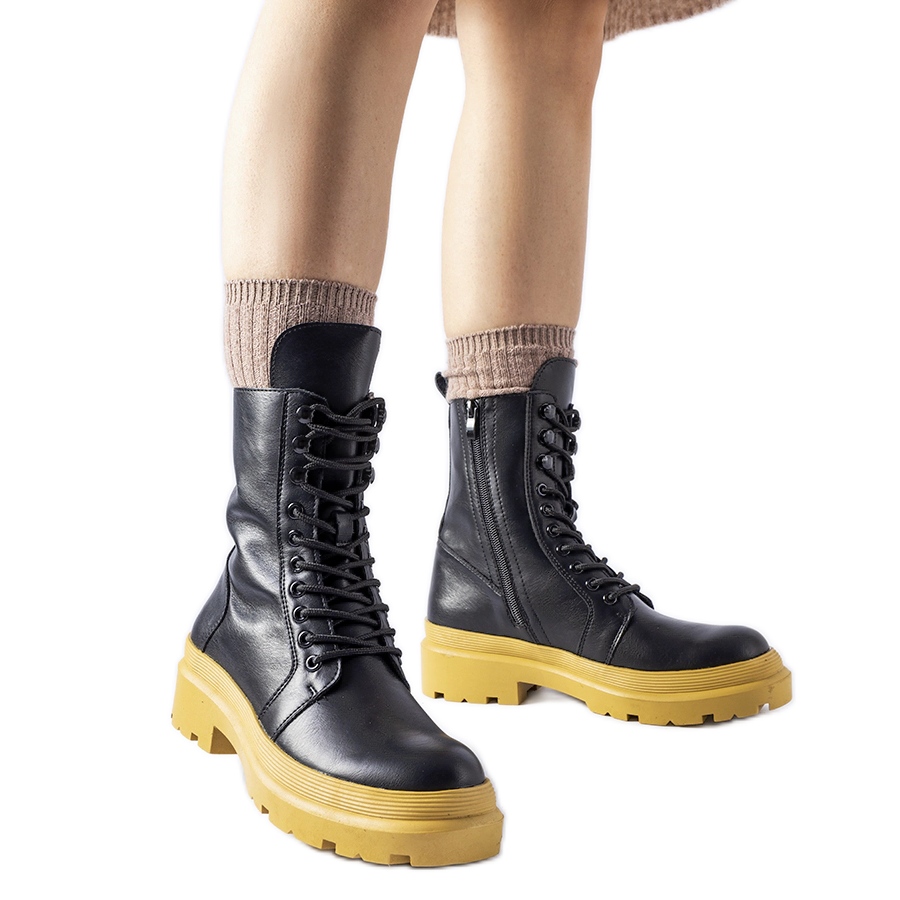 Quennie fekete túrázás egy színes talpon - elegáns, meleg és kényelmes csizma az őszi téli szezonra. Kiváló minőségű ökológiai bőrből készül, a szigetelt belső tér termikus kényelmet biztosít, és a kontrasztos sárga gumi talp az egésznek modern, bátor karaktert ad. A zseb cipzáras rögzítőeleme megkönnyíti a felhelyezést, a kerek orr és egy lapos, 4 centiméter sarok garantálása egész nap.
