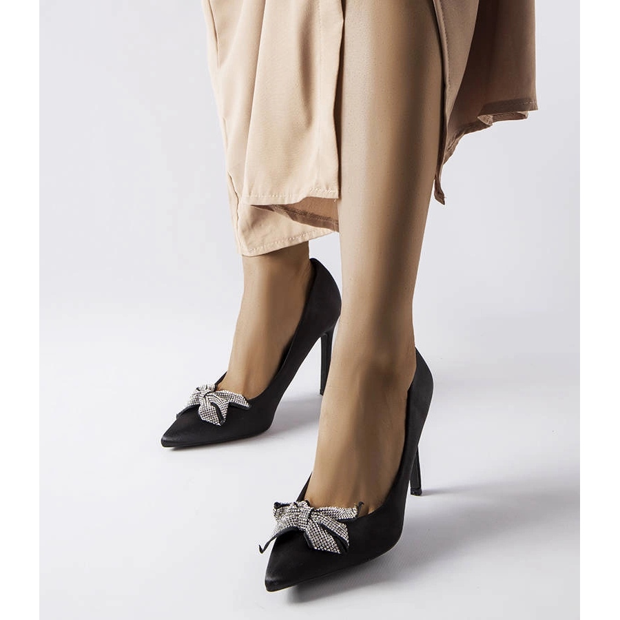 Fekete magas sarkú cipő szatén kivitelben íj - elegancia és stílus minden alkalomra