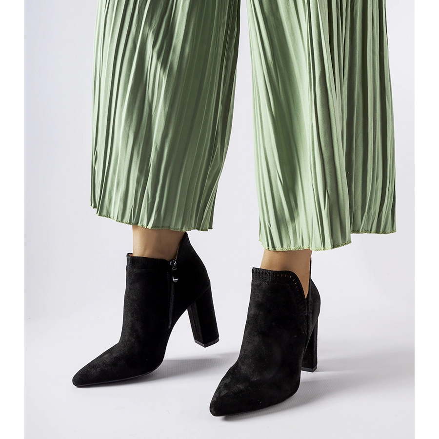 Rövid, női Cammoro A8705 csizma ökológiai velúr bőrből, klasszikus fekete színű. A bokamodell dekoratív, karcsú orrú és stabil sarok -típusú sarokokkal mind a mindennapi, mind az elegánsabb stílusban működni fog. A cipzáras rögzítőelem megkönnyíti a felhelyezést, és a melegítés kényelmet biztosít a hűvösebb napokon.
