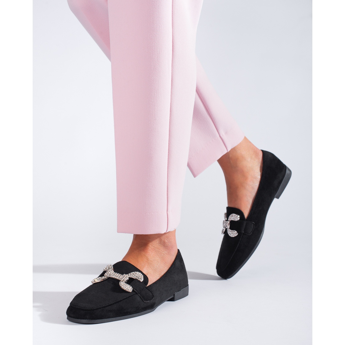 A mokaszinok belsejében ökológiai bőrből készült talpbetét található, amely tovább növeli a használat kényelmét. A klasszikus fekete szín rendkívül univerzálissá teszi - sokféle stílushoz passzolnak, a cirkóniák és strasszok formájú kiegészítő dekorációk pedig egyedi karaktert adnak nekik.