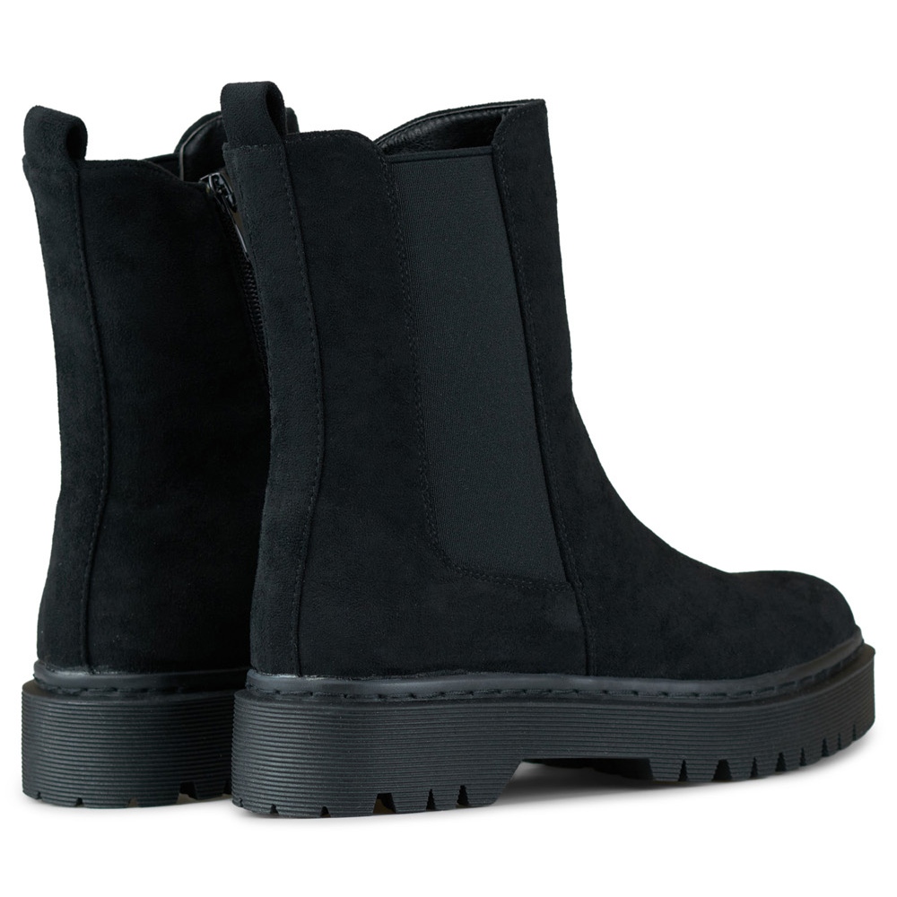 Elegáns, időtlen csizmák ökológiai velúrból, mély fekete színben. Egy stabil, vastag talp, 4 cm -es platformmal és egy puha, szigetelt betéttel (lábbeli takaró) biztosítja a hőt és a kényelmet a hűvösebb napokban, és a klasszikus, kerek lábujja miatt a cipő mind alkalmi, mind kissé elegánsabb stilizációkkal megfelel.