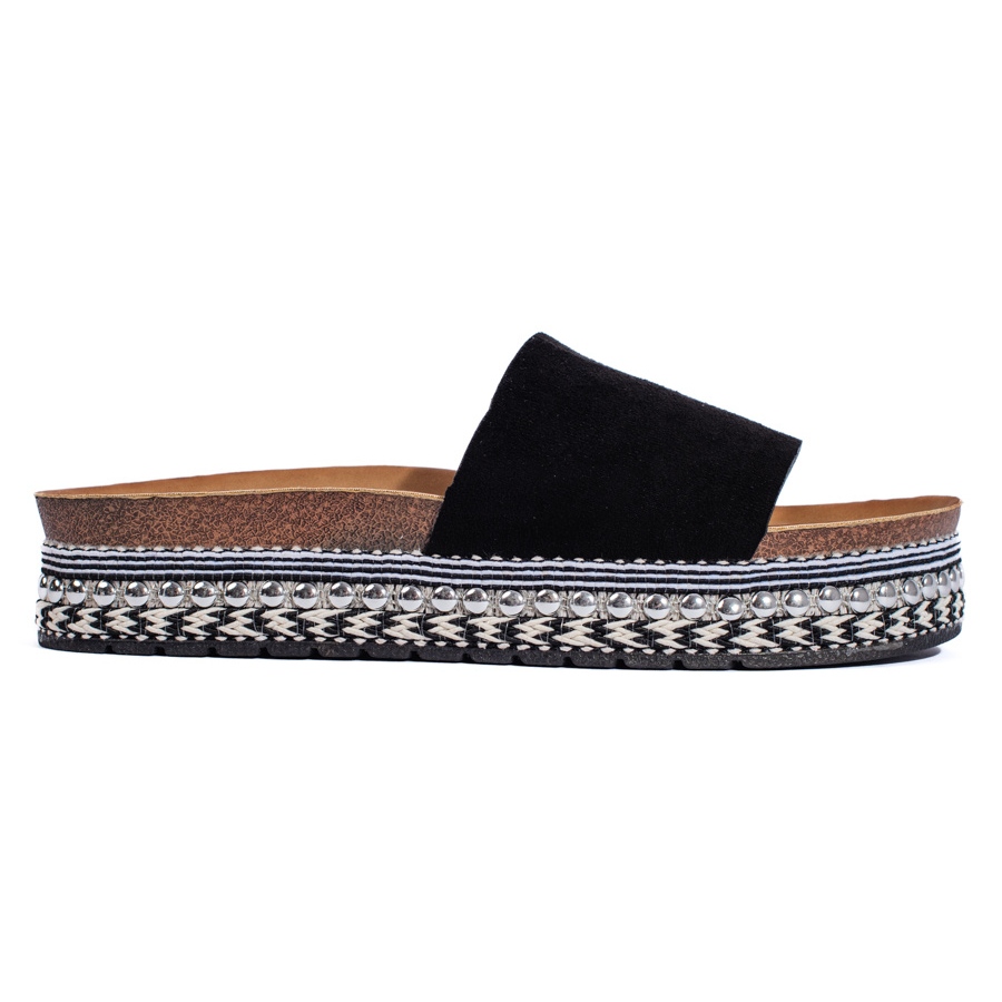 Az ökológiai velúrbőrből készült papucsok kivételesen elegáns megjelenésűek, puha, textil belső anyaguk pedig egész napos viselési kényelmet biztosít. A 4 cm magas platform kiváló stabilitást garantál és a lábakat is meghosszabbítja. A sima fekete műanyag talp tapadást és tartósságot biztosít, így tökéletes választás a mindennapi használatra.