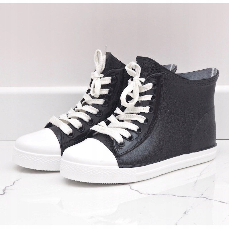 Ezek az egyedi wellington tornacipők tökéletes választás azoknak a nőknek, akik praktikus és egyben stílusos lábbelit keresnek rossz időjárásra. A fekete magas szárú tornacipőket úgy tervezték, hogy utánozzák a klasszikus tornacipők megjelenését, de kiváló minőségű gumiból készültek, kiváló védelmet nyújtanak az eső és a nedvesség ellen.