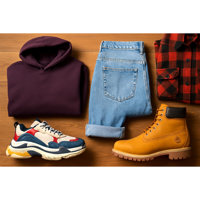 A táskás, laza szabású vagy az ácsfarmerekhez nagyobb lábbelire van szükség, amely kiegyensúlyozza a széles sziluettet. Tökéletesek lesznek: vaskos tornacipők (Balenciaga Triple S, Nike Air Max), magas csizmák, Dr. Martens, Timberland csizmák, munkacipők, harci csizmák, vastag gördeszkás cipők. A túl finom lábbelik elvesznek a széles lábak alatt. A lábak feltekerése szándékosabbá teszi a formázást. Streetwear megjelenés: túlméretezett farmer + vaskos tornacipő + oversize kapucnis pulcsi. Munkaruha stílus: asztalos farmer + Timberland nadrág + flanel ing.