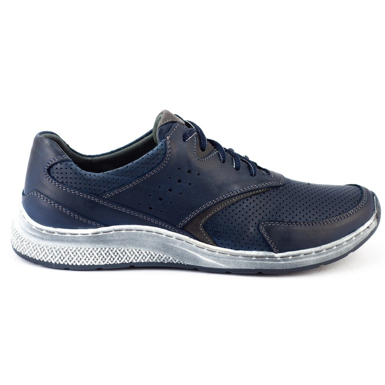 Fedezze fel a kényelmet és a stílust a sötétkék és kék árnyalatú Polbut J72 férfi sportcipővel. Kiváló választás azoknak a férfiaknak, akik értékelik a mindennapi kényelmet a vonzó dizájnnal kombinálva. A kiváló minőségű természetes bőrből készült cipők nemcsak esztétikus megjelenést biztosítanak, hanem könnyen tisztíthatók is.