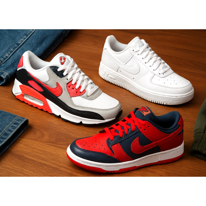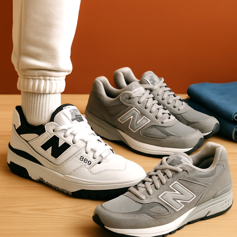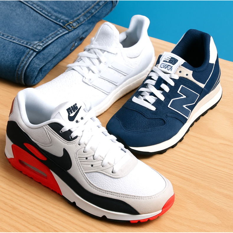 Air Max 90 (szürke/fehér), New Balance 550 (fehér/szürke), Ultraboost (fekete/szürke). Lezser, kényelmes, univerzális.